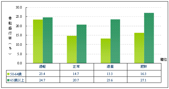 經常節食及體重過輕會減少雌激素分泌,加速骨質流失,造成骨質含量變少及肌耐力降低而容易發生骨質疏鬆,過重、肥胖則會增加骨頭、關節的負擔,根據國民健康局98年國民健康訪問調查結果顯示,相較於正常體位的民眾,過輕、過重、肥胖有較高的骨質疏鬆比率(表3)。健康局建議民眾,維持理想體重,不但可以減少骨質疏鬆問題,同時也可以預防高血壓、糖尿病、心血管疾病的發生,因此當身體質量指數[BMI計算方式=(體重(公斤)/身高的平方(公尺)2] <18.5或BMI≧24,就要注意維持及控制自己的體重了!